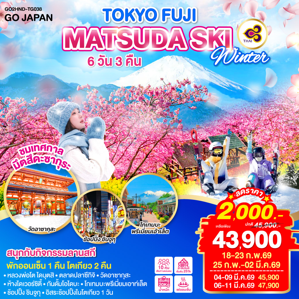 | 2 | โตเกียว (สนามบินฮาเนดะ) – เมืองคามาคุระ – หลวงพ่อโต ไดบุตสิ – เมืองมัตสึดะ – เทศกาลมัตสึดะซากุระ – โกเทมบะพรีเมี่ยมเอ้าท์เล็ต – แช่น้ำแร่ธรรมชาติ – เมนูบุฟเฟต์ขาปู | ✘ | ✔ | ✔ | KAWAGUCHIKO or YAMANAKAKO ONSEN AREA หรือเทียบเท่าในระดับ 3 ดาว |
