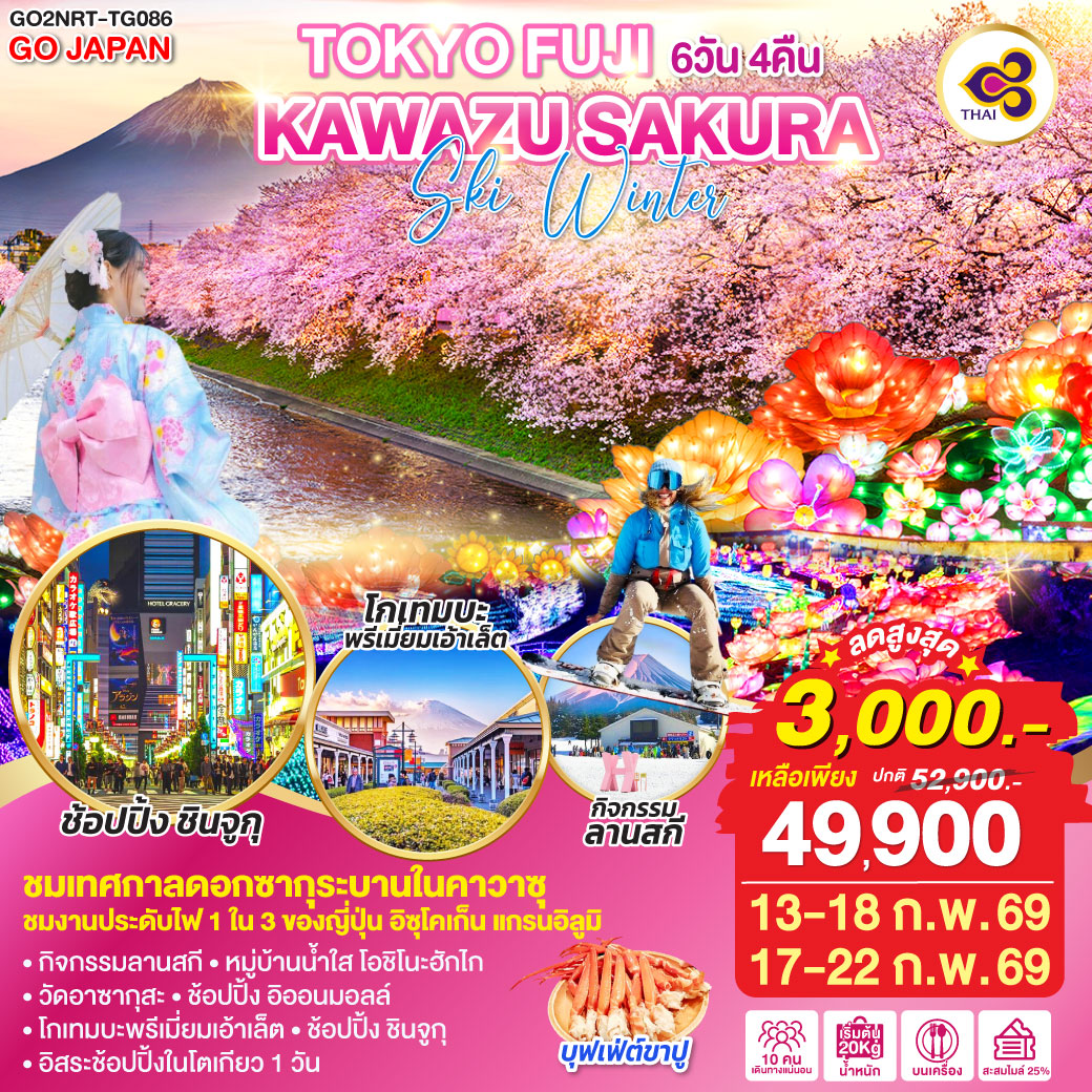| 4 | กิจกรรม ลานสกี – ชมวิวฟูจิ ริมทะเลสาบ คาวากุจิโกะ – กิจกรรม ชงชาญี่ปุ่น – หมู่บ้านน้ำใส โอชิโนะฮักไก – เมืองโตเกียว – ช้อปปิ้ง ชินจูกุ | ✔ | ✔ | ✘ | TOKYO HOTEL AREA หรือเทียบเท่าในระดับ 3 ดาว |