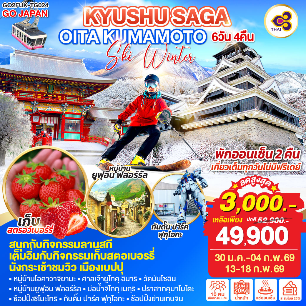 | 4 | กิจกรรม ลานสกี – เมืองคุมาโมโตะ – ปราสาทคุมาโมโตะ - ซากุระโนะบาบะ โจไซเอ็น – ช้อปปิ้งชิโมะโทริ | ✔ | ✔ | ✘ | KUMAMOTO HOTEL AREA หรือเทียบเท่าในระดับ 3 ดาว |